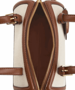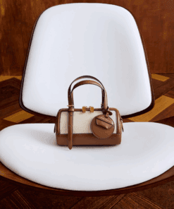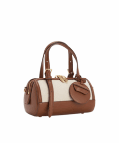 Bowling bags are having a moment — this Enola piece definitely deserves as spot in your bag collection. Smooth chocolate-brown faux leather is contrasted with the rough texture of beige canvas to create a warm, neutral-tone design. Featuring adjustable double-handles and a detachable keychain, this bag is as functional as it is stylish.